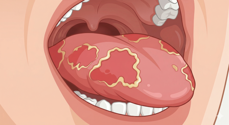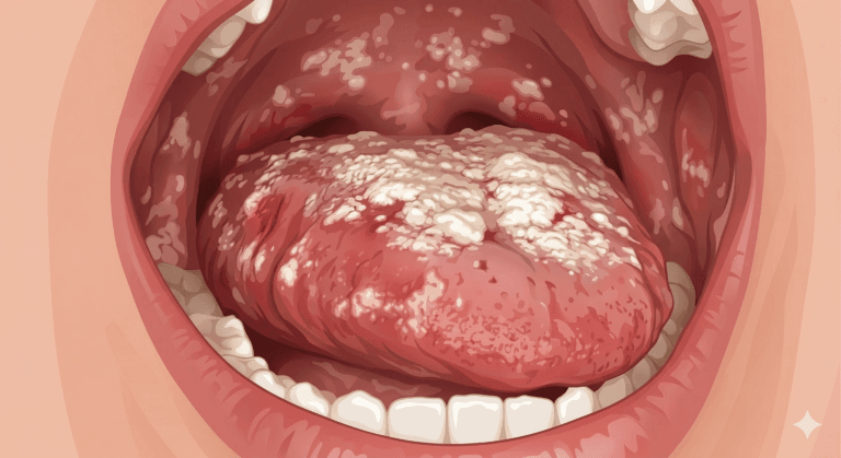 Λευκές, κρεμώδεις πλάκες στη γλώσσα και το εσωτερικό του στόματος που εμφανίζονται συνήθως μετά από χρήση αντιβιοτικών ή όταν το ανοσοποιητικό σύστημα είναι εξασθενημένο.
